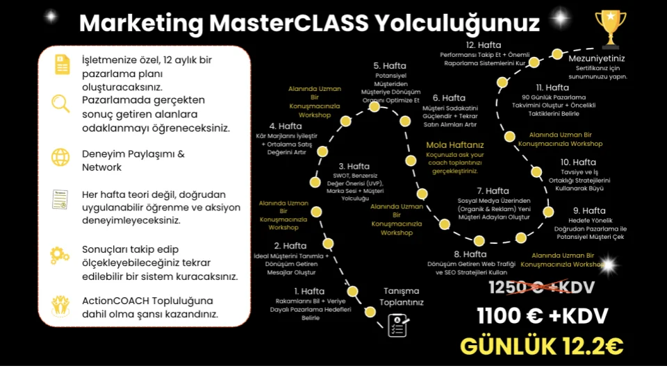 Dünya çapında binlerce işletmede uygulanan MasterCLASS programı, işletmenizi size bağımlı olmaktan çıkarıp, özgürce büyütebileceğiniz bir sisteme dönüştürmek için tasarlandı.